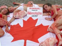 22.07.2009 - Heute Nachmittag protestierten Aktivisten der Tierrechtsorganisation PETA in Potsdam gegen das kanadische Robbenschlachten. Blutverschmiert lagen Babyrobben und drei mit Kunstblut überströmte „gehäutete“ Aktivistinnen auf einer kanadischen Flagge. Weitere Tierschützer informierten über das grausame Töten für den Pelzhandel und forderten zum Verzicht auf Pelzkleidung auf.